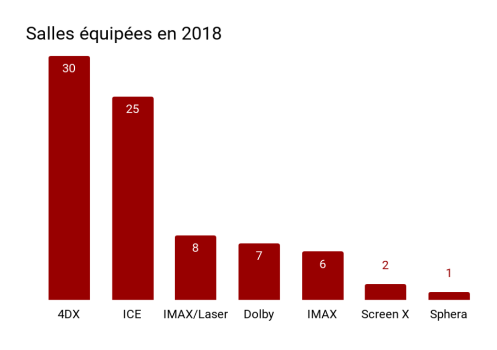 Rompu aux technologies, comme la 4K, la 3D ou la projection laser, déployées depuis de nombreuses années, le parc de salles français assiste ces derniers temps à l’émergence des salles premium. Ainsi, six concepts étaient utilisés l’an passé dans l’Hexagone : IMAX, Dolby Cinema, 4DX, ICE, Screen X et Sphera auxquels il faut ajouter depuis 2019 l’écran Onyx LED. En 2018, 66 cinémas possédaient au moins une salle premium, soit 3,2 % des cinémas actifs, contre 5 en 2016. Un nombre qui devrait dépasser les 100 sites à horizon 2020 d’après les estimations du CNC. En tout, sont dénombrées 79 salles premium dont 30 en 4DX et 25 en ICE. Cela représente plus de 86 000 séances (1 % du total français) et 3,2 millions d’entrées (1,5 % des 201 millions totalisées). L’Île-de-France regroupe un quart des établissements comptant au moins une salle Premium. L’Auvergne-Rhône-Alpes (13,6 %), l’Occitanie (12,1 %) et la Provence-Alpes-Côte d’Azur (10,6 %) sont les trois autres régions à abriter au moins 10 % des concepts.