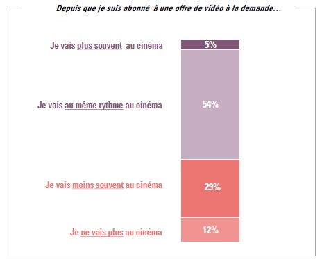 L’étude confirme par ailleurs que les abonnés à la SVOD sont globalement plus jeunes que l’ensemble de la population : 29 % des 35-49 ans contre 10 % chez les 65 ans et plus.  En outre, l’impact des abonnements SVOD sur la fréquentation des salles de cinéma se vérifie, 41 % des abonnés SVOD déclarant aller moins souvent voire plus du tout au cinéma.
