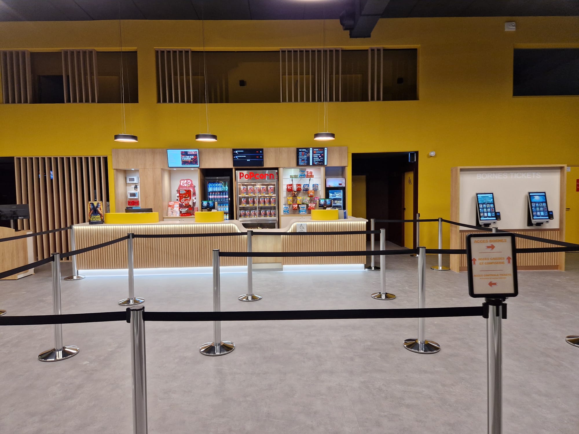 Validé par la CDACi du Nord dans une première version en 2019, puis avec une nouvelle mouture en 2023, le projet s’est donc concrétisé en cette fin d’année. Le Ciné Pévèle a pris ses quartiers, toujours en centre-ville, aux côtés d’un centre commercial, dans la zone de loisirs Tempo qui accueillera prochainement un restaurant et une salle de sport. Clin d’œil à son territoire, l’établissement arbore une extérieur intégralement en briques rouges, tandis qu’une large baie vitrée encadre l’entrée. S’il loue la coque, l’exploitant possède le fonds de commerce et a pu aménager, à sa guise, l’intérieur, avec le concours de l’architecte Alain Balzac. Le hall de 250 m2, aux tons jaunes et gris, comprend un comptoir caisse-confiserie, deux bornes automatiques et un coin détente où un écran diffuse des bandes annonces. Cet espace pourrait, « en fonction de la fréquentation, se transformer à moyen terme en une quatrième salle », indique Alexandre Moquet.