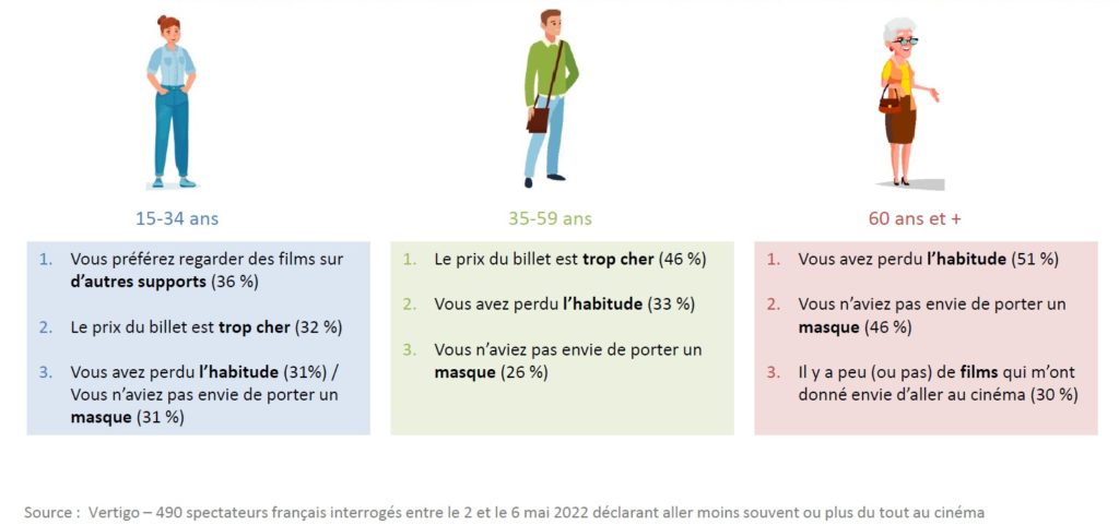 Partant de ce constat, il devenait donc nécessaire d’éclaircir les raisons de ce qui est plus une perte d’habitude qu’un désamour du public pour la salle. Vertigo a donc interrogé plus de 1 000 spectateurs entre le 2 et le 6 mai sur leurs habitudes depuis la réouverture du 19 mai 2021. Si l’on peut se réjouir que plus de la moitié des Français disent être revenus en salles au cours d’une période encore marquée par l’épidémie, reste que 48 % ont largement modifié leur comportement, 34 % déclarant y aller moins qu’avant et 14 % plus du tout, majoritairement des actifs franciliens âgés de 25 à 59 ans. Cinq raisons prédominent pour justifier ce non retour, liées à la crise sanitaire (perte d’habitude et refus de porter le masque) mais aussi structurelles (cherté de la place, préférence pour d’autres supports et faible attractivité de l’offre)… sachant que ces raison sont perméables entre elles.