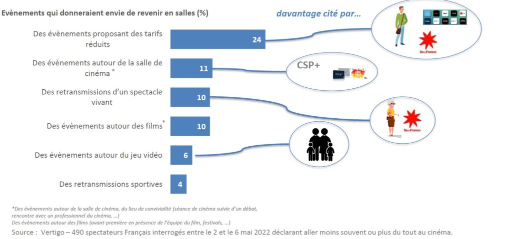 Ces cinq raisons qui émergent parmi toutes celles avancées laissent tout de même entrevoir plusieurs leviers d’actions pour tenter de les résorber. Vertigo a donc interrogé les répondants moins présents en salles sur la typologie des films pour leur donner envie de revenir. Les comédies sont plébiscitées à 42 %, et en premier par les 35-59 ans, actifs, vivant en région parisienne et abonnés à une plateforme. Suivent les titres français (39 %), premier chez les retraités et les inactifs ; les thrillers (31 %) ; les films fantastiques (29 %), premier chez les moins de 35 ans. Ensuite, à la question : quels événements pour redonner envie d’aller au cinéma, 24 % des répondants mettent en avant des tarifs réduits, davantage cité par les 35-59 ans, loin devant des actions autour de la salle (11 %), des films (10 %) ou des retransmissions de spectacle vivant (10 %).