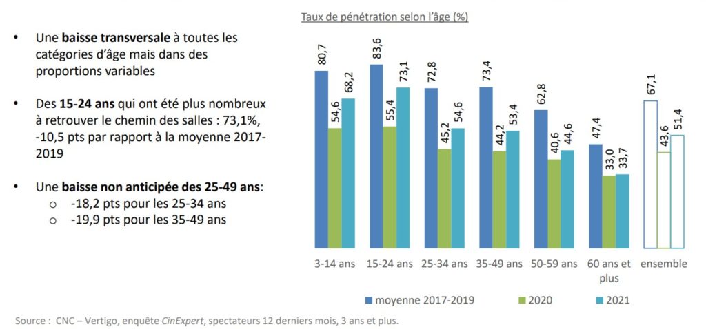 Si l’on reprend les chiffres depuis la reprise de mai 2021, quelque 150 millions d’entrées ont été comptabilisées dans les cinémas français, en retrait de 28 % par rapport à la moyenne 2017-2019. Sur la seule année 2021 (95,5 millions de billets), les salles indépendantes (40,2 M) affichent un recul de 28 % contre -64 % pour les circuits (55,3 M) ; les établissements classés art et essai ont chuté de 49 %, les autres de 57 %. 32,7 millions de Français sont allés au moins une fois au cinéma : cela représente 51,4 % de la population, et certes une baisse de 16,9 points par rapport à 2019, mais encore plus de la moitié de nos concitoyens. S’agissant des tranches d’âge, les 15-24 ans ont retrouvé plus rapidement le chemin des salles, n’accusant qu’un retard de 10,5 points sur la moyenne 2017-2019. « Un chiffre à mettre en parallèle avec la politique pro-active menée en direction du public jeune, qui reste une priorité pour le CNC », a commenté Magali Valente. A contrario, « ce sont les actifs de 25-49 ans qui ont le plus déserté les salles depuis la réouverture, ce que le CNC n’avait pas du tout anticipé », a souligné Olivier Henrard, directeur général délégué du Centre, cette tranche affichant une baisse de 26 % par rapport à 2017-2019. À noter que le nombre moyen d’entrées sur le seul segment 25-34 ans chute de 64 % pour s’établir à 1,6, le plus faible niveau toute tranche d’âge confondue.