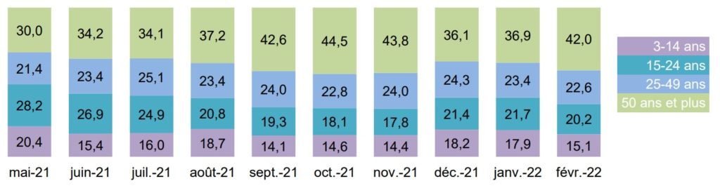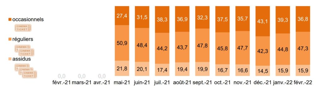 Concernant les habitudes de fréquentation, la part des occasionnels continue de fondre (36,8 % vs 39,3 % en janvier) quand celle des réguliers retrouve le niveau de novembre (47,3 %). Enfin, les assidus restent encore dans une fourchette basse à 15,9 %, suivant une tendance globale à la baisse depuis la réouverture de mai 2021 (voir graphique ci-dessous).