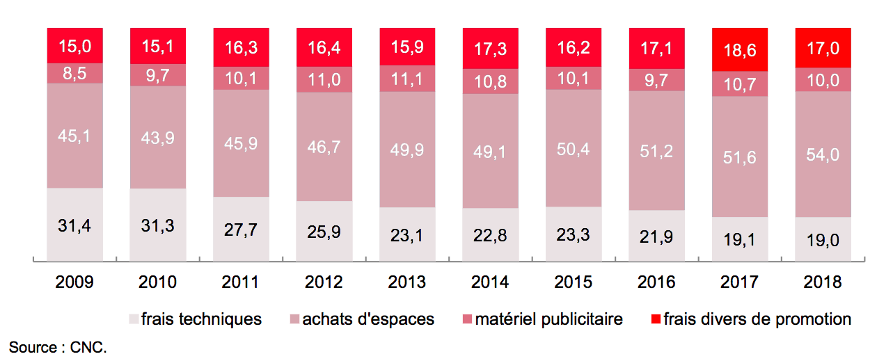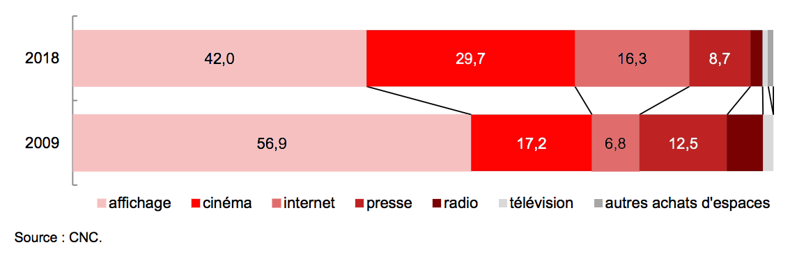 Ces dix dernières années ont été marquées par une évolution notable de la place de la publicité cinéma dans les salles. La part des achats d’espaces est passée de 17,2 % en 2009 à 29,7 % en 2018 (+75,7 %), progression structurelle due à la réduction de la part des bandes-annonces gratuites. En parallèle, la part d’internet dans les dépenses publicitaires des distributeurs a augmenté de 145,7 % en dix ans. La salle de cinéma est devenue le deuxième média utilisé pour la promotion des films avec 29,7 % des dépenses, devant internet (16,3 % des dépenses), mais derrière l’affichage (42 %).