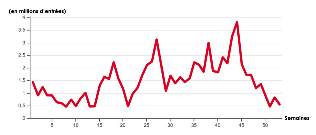 Cumul des entrées hebdomadaires des films d’horreur sur la période 2002-2022 :