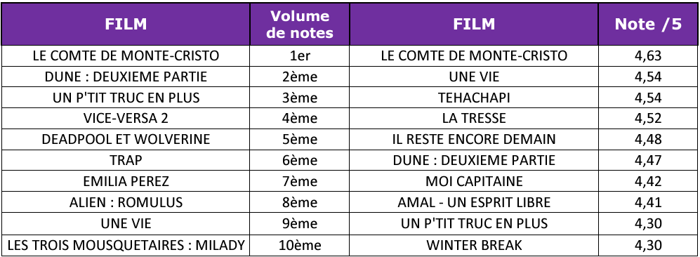 Le Comte de Monte-Cristo est le film le plus et le mieux noté de 2024 à ce jour, avec une note certifiée de 4,6/5. Si, sans surprise, les stars du box-office 2024 dominent le classement des films les plus notés, le circuit se réjouit d’un classement par note « qui illustre toute la diversité du cinéma ». Ainsi, classement des films les mieux notés affiche de belles surprises, comme Une vie de James Hawes, le documentaire Tehachapi de JR, La Tresse de Laetitia Colombani, Il reste encore demain de Paola Cortellesi, Moi capitaine de Matteo Garrone, Amal – un esprit libre de Jawad Rhalib et Winter Break d’Alexander Payne.