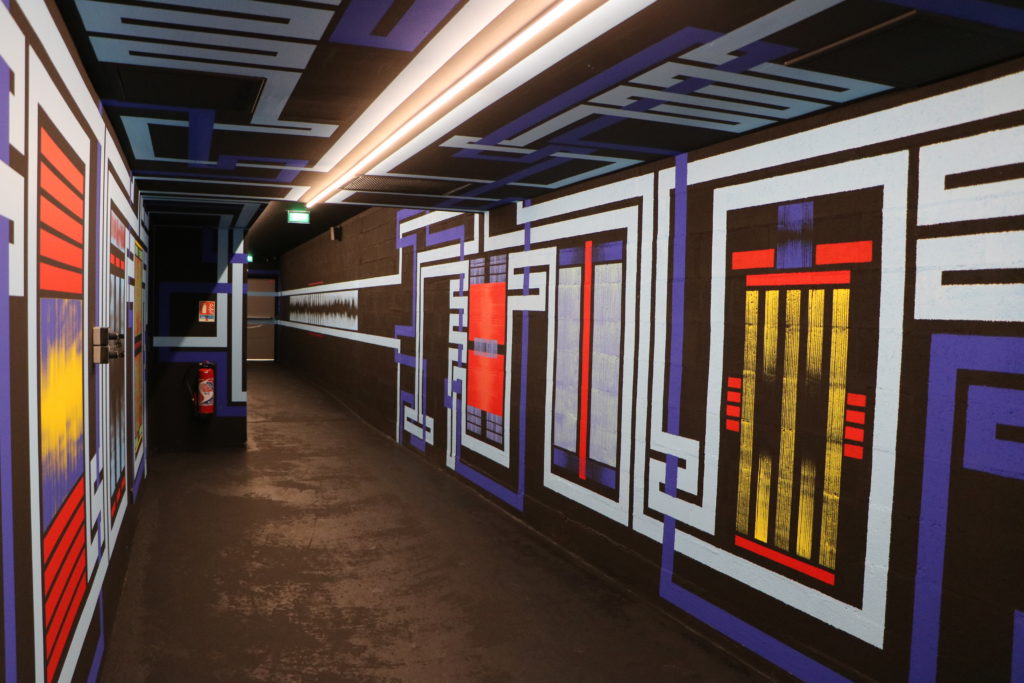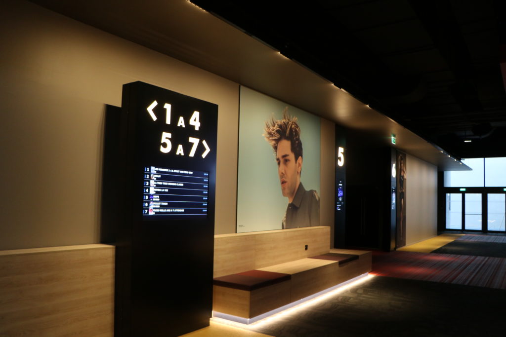 L’entrée du cinéma se fait à pied le long d’un cours central entre jardins et immeubles. Une large baie vitrée donne sur l’espace d’accueil et le hall, équipé de cinq bornes. Le comptoir, doté de trois caisses mixtes, est quant à lui réalisé à partir d’un matériau recyclé de bouchons de bouteilles transformés à Aubervilliers. Le public est ensuite invité à descendre au foyer, où s’articulent les sept salles autour d’un espace détente aux couleurs chaudes et de grands portraits de comédiens. Dans la lignée des dernières rénovations et créations, le groupe tient à promouvoir l’art contemporain. Ainsi la façade et l’aménagement intérieur du cinéma ont été confiés aux deux artistes Kenia Almaraz Murillo et Elliott Causse. Leur fresque Abysses habille le cinéma de l’entrée jusqu’aux sorties. Côté technique, les sept salles en soubassement sont toutes équipées en laser et son 7.1 et disponibles à l’achat en ligne dématérialisé et numéroté.