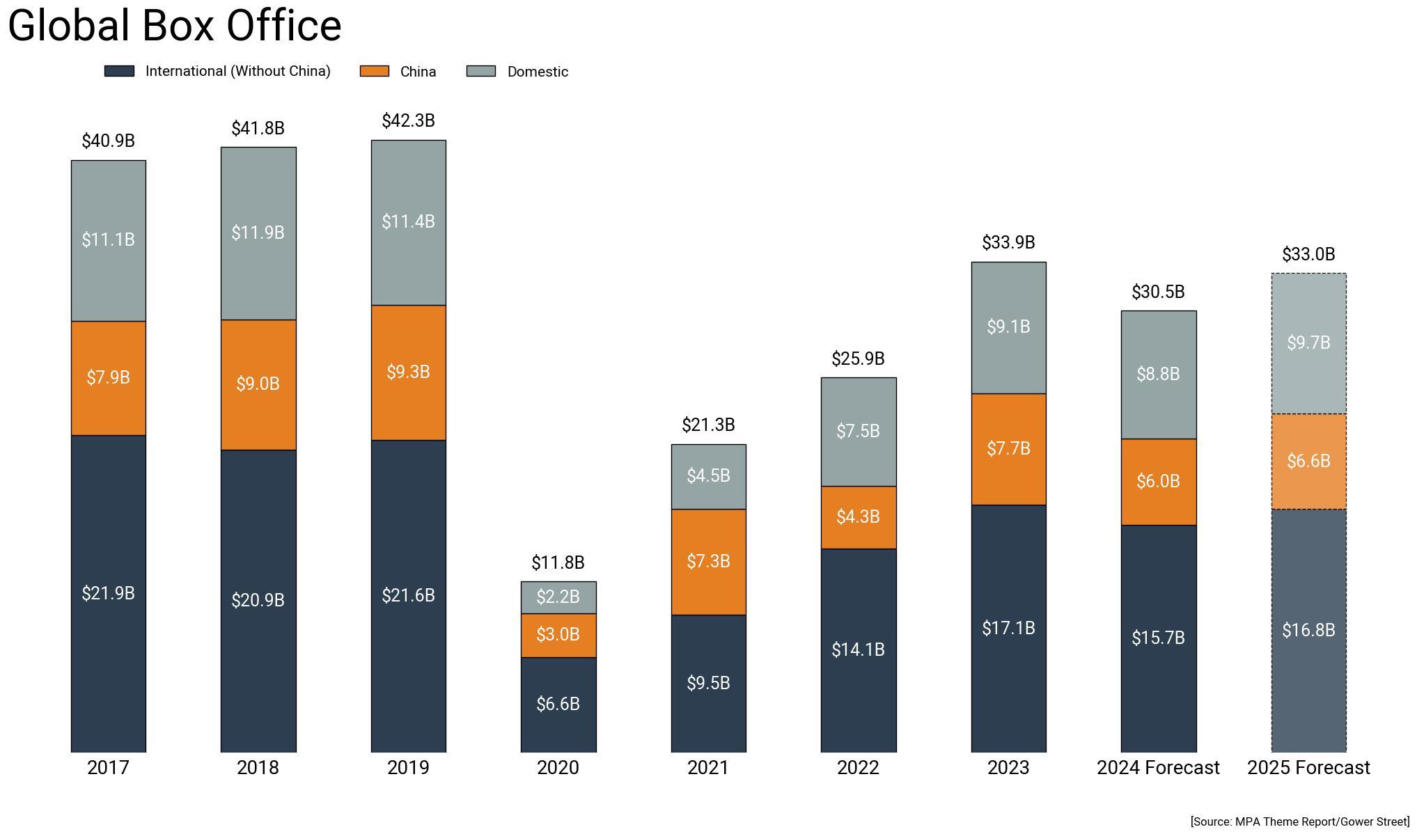 Le box-office mondial devrait grimper à 33 milliards de dollars (Md$) en 2025, ce qui représenterait une hausse de 8 % par rapport à celui de 2024, estimé à 30,5 Md$, fortement impacté par le manque de films américains. Il serait en revanche inférieur de 3 % par rapport aux 33,9 Md$ enregistrés en 2023, et de 14 % par rapport à la moyenne 2017-2019 (41,6 Md$). 2025 serait portée par un line-up complet, et fourni de multiples nouvelles itérations de franchises à succès, telles qu’Avatar, le Marvel Cinematic Universe, Mission: Impossible, Jurassic World ou encore John Wick, un sequel à Zootopia, le lancement du nouveau DC Universe avec Superman, la deuxième partie de Wicked, et bien d’autres films qui peuvent créer la surprise (Mickey 17, F1…). « Il y a fort à parier que le résultat dépasse nos attentes », annonce Rob Mitchell, directeur de Theatrical Insights chez Gower Street.