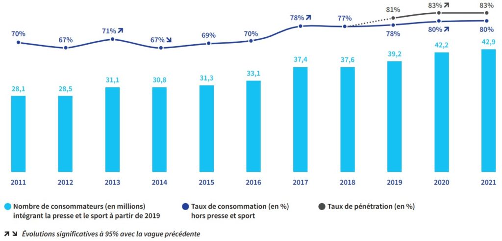Après la hausse de 2020 – liée notamment à la crise sanitaire et au développement des pratiques en ligne ainsi que celui de nouvelles offres SVOD –, le taux de consommateurs de biens culturels dématérialisés en général se stabilise en 2021. Il concerne 83 % des internautes*, soit près de 43 millions de consommateurs.