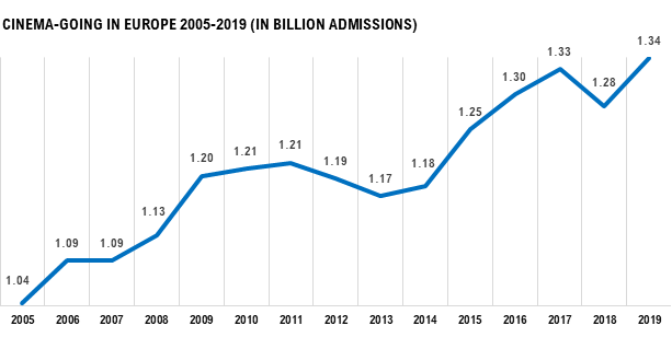 1,34 milliard de spectateurs ont franchi le seuil des cinémas européens en 2019. Un résultat record sur les quinze dernières années : c’est la troisième fois que la fréquentation atteint 1,3 milliard d’entrées après 2016 et 2017. Si l’Union internationale des cinémas (UNIC) indique que les chiffres de certains territoires ne sont pas définitifs, elle assure que le box-office du continent européen va dépasser les 8,5 milliards d’euros, contre 8 milliards en 2018. À noter que les salles de l’Union européenne franchissent pour la première fois depuis 2004 le milliard de spectateurs pour 7,1 milliards d’euros de chiffre d’affaires.
