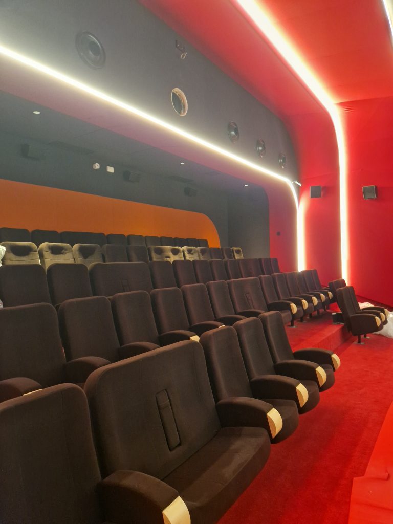 L’espace disponible à l’intérieur s’est révélé particulièrement contraint. « Il a fallu intégrer quatre salles de plain pied, un hall d’accueil, les sanitaires et tous les espaces techniques dans 1 200 m², sans renoncer au confort qui fait notre identité », souligne Jean Villa. Avec les prouesses d’ingénierie d’ID Ciné et le savoir-faire de l’équipementier Mediatechniques, les machines de traitement de l’air ont été déployées sous le sol… « et trois des quatre projecteurs intégrés dans les soffites à l’arrière des salles ». L’innovante technique qui économise l’espace cabine a « déjà été mise en oeuvre aux Balcons de Mougins de CinéWest, mais à ma connaissance encore jamais à ce degré d’intégration », estime Jean Villa, en décrivant les solutions qui garantissent la bonne ventilation des projecteurs – tous laser – et le lift intégré pour assurer leur maintenance.