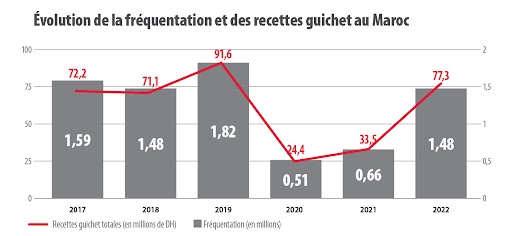 Les recettes guichet s’élèvent à 77,3 millions de dirhams (DH) [plus de 7,1 M€], soit une baisse de 16 % par rapport à 2019… mais seulement de 1 % par rapport à la moyenne 2017/19.