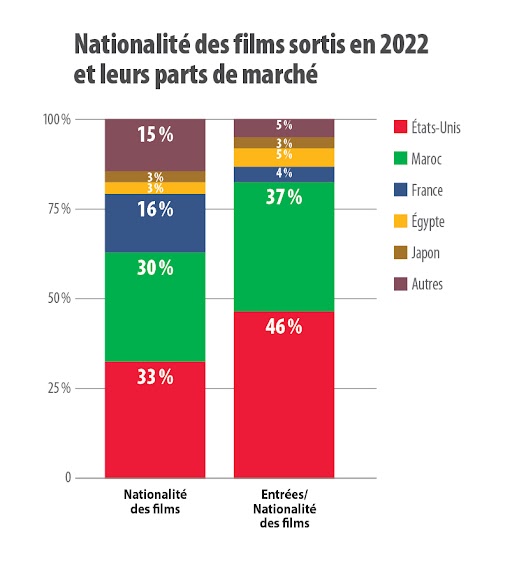 Les 39 films français sortis au Maroc en 2022 (16 % des sorties) n’ont représenté que 66 000 entrées (4 %) – soit une part de marché plus faible que les 8 films égyptiens, qui ne représentent que 3 % des sorties mais qui ont généré près de 80 000 entrées (5 %).